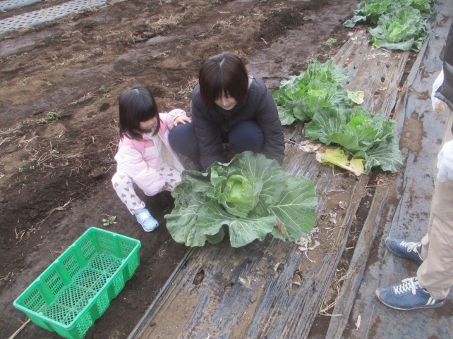 白菜やキャベツは刃物を使うのでスタッフが刈りました。