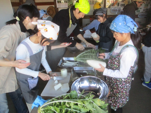 プログラムは、防災訓練をかねて収獲した野菜を使った芋煮汁作り、塾のまとめとして模造紙作成、すべての野菜の収穫、等盛りだくさんになりました。