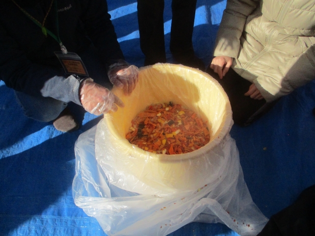 初めに葉物野菜の小松菜やコカブやほうれん草を収穫、次に大物の白菜やキャベツや大根を収穫しました。